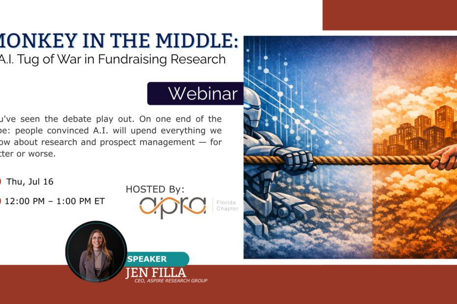 You’ve seen the debate play out. On one end of the rope: people convinced A.I. will upend everything we know… Read More »Monkey in the Middle: A.I. Tug of War in Fundraising Research